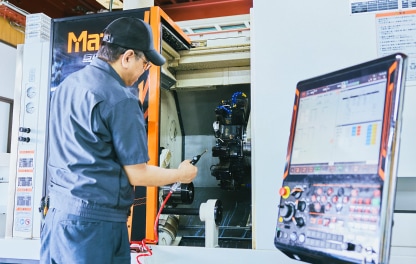 CNC旋盤加工を導入し、プログラム制御によって24時間稼働を可能にすることで、人件費などのコストを抑えながら短納期を実現することに成功しました。また治具や切削油といった旋盤加工に使用するツールも定期的に見直し、常に技術向上に努めています。